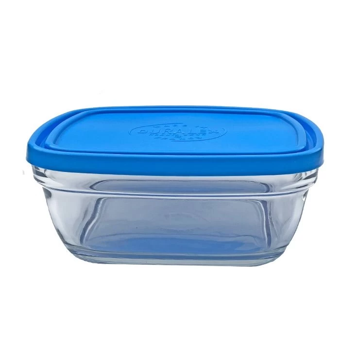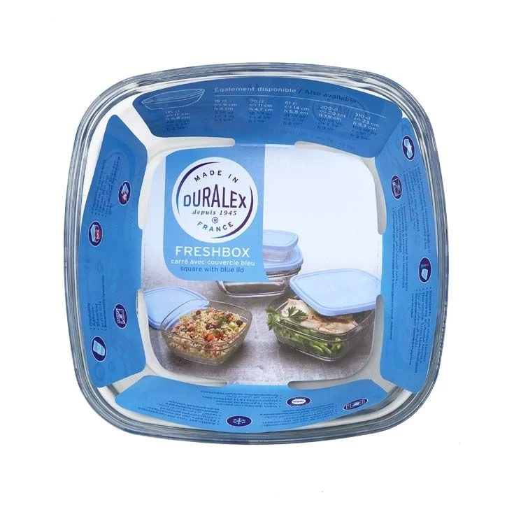 Boîte de conservation en verre Duralex. Sa dimension de 17 cm x 17 cm est suffisante pour conserver des restes de cuisson, légumes, viandes, poissons, et tout autre aliment non liquide, le couvercle n’est pas étanche à l’eau.