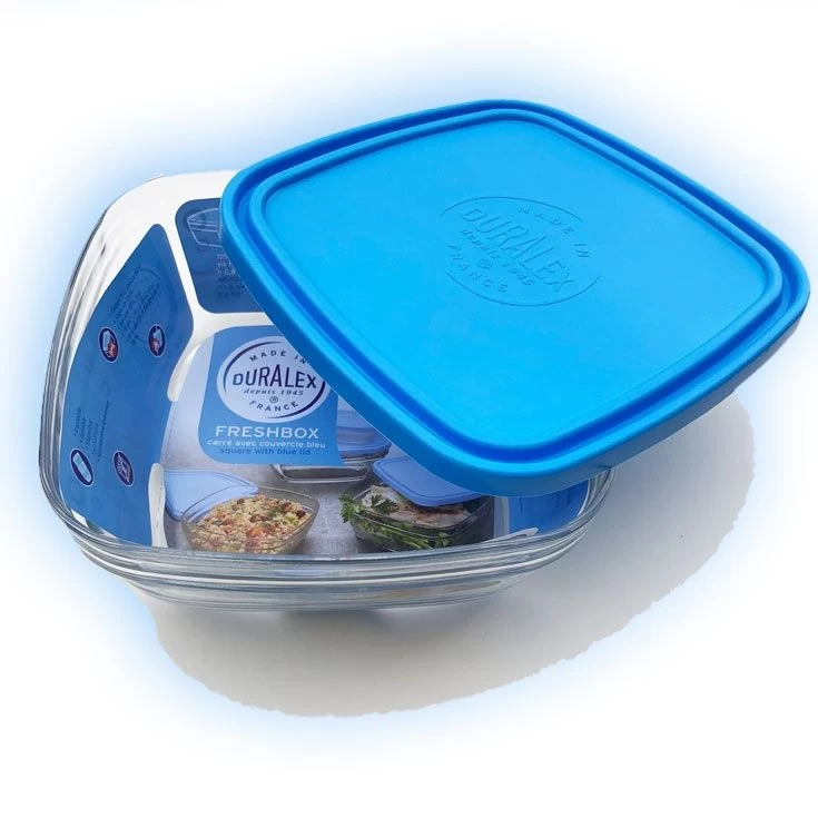 Compatible au micro-ondes, congélateur et lave vaisselle. Le verre ultra résistant est hygiénique non poreux, et très résistant aux chocs. Son couvercle bleu ne dispose pas de BPA.