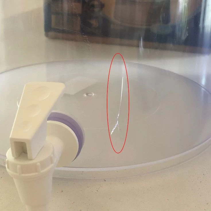Fontaine neuve ayant eu un problème de transport. Le récipient du bas à une fissure visible mais la paroi n’est pas fendue. Vous trouverez ci-joint les photos.